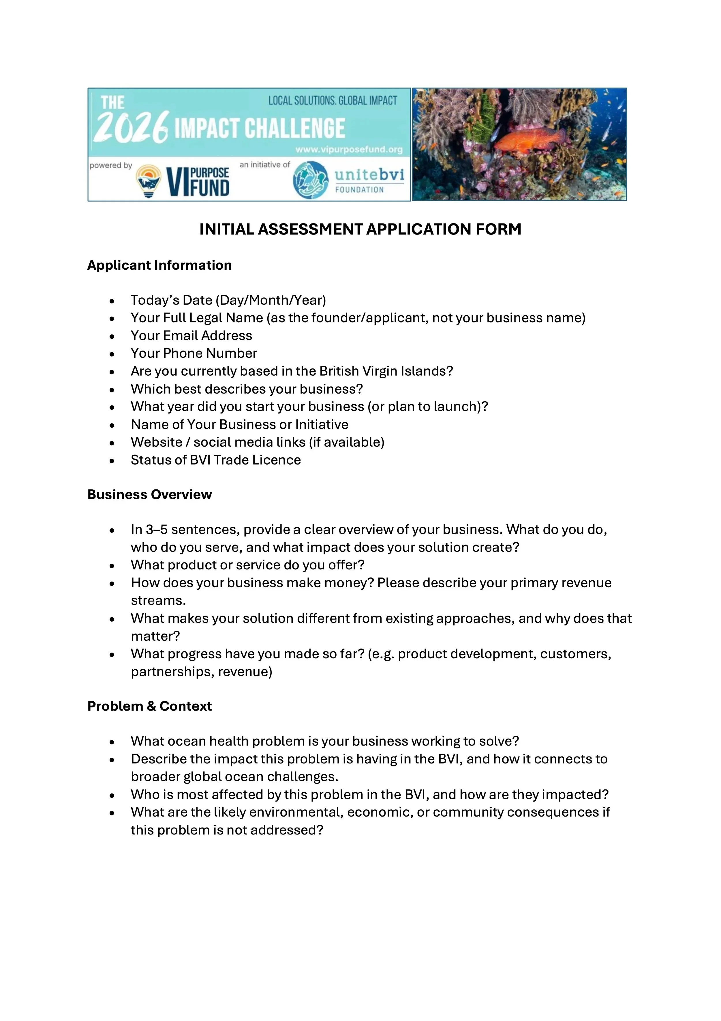 Please submit your Initial Assessment using the online form via the APPLY NOW button above. A reference version is provided below for your convenience.)